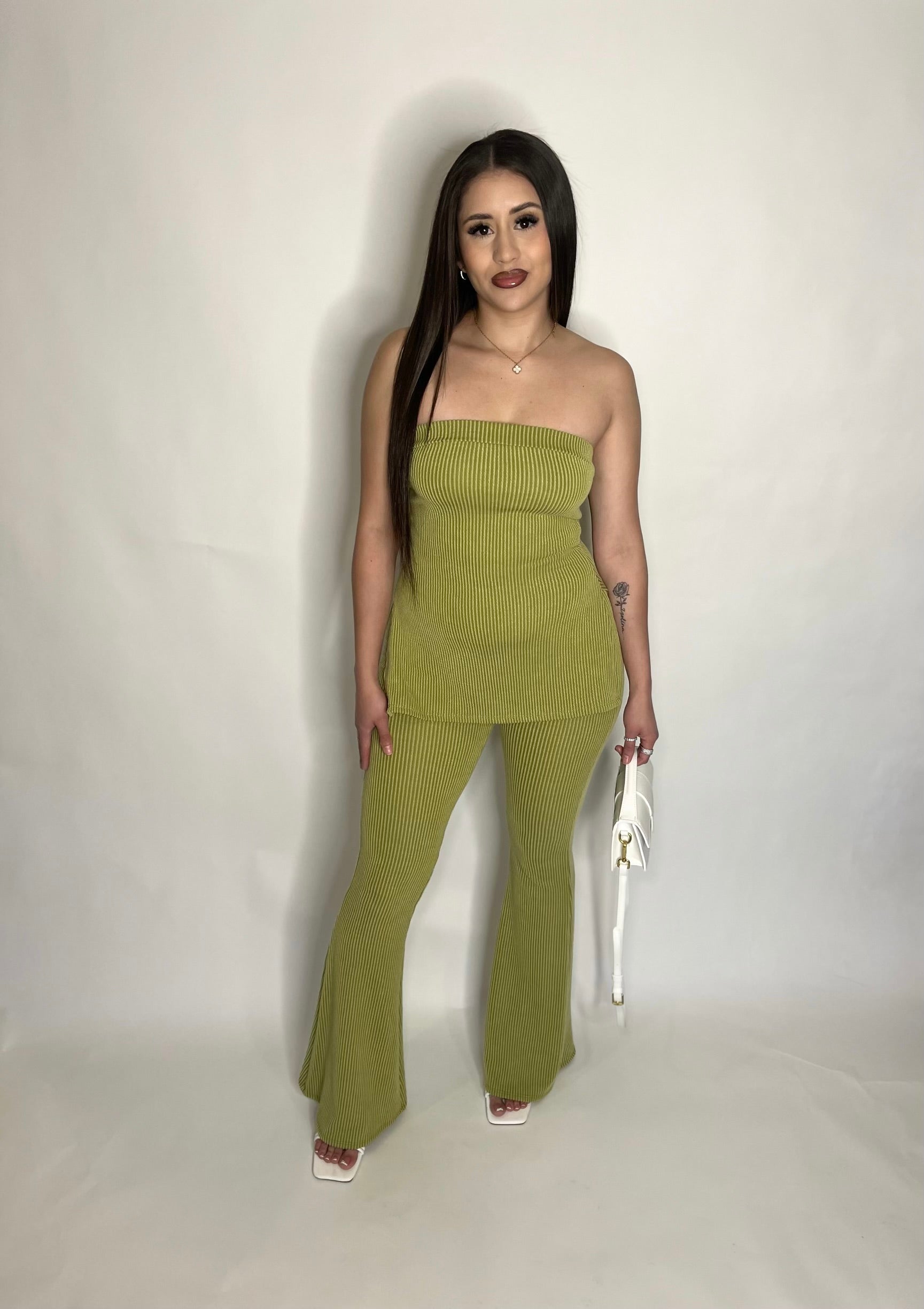 RIB KNIT TUBE TOP AND FLARE PANTS SET