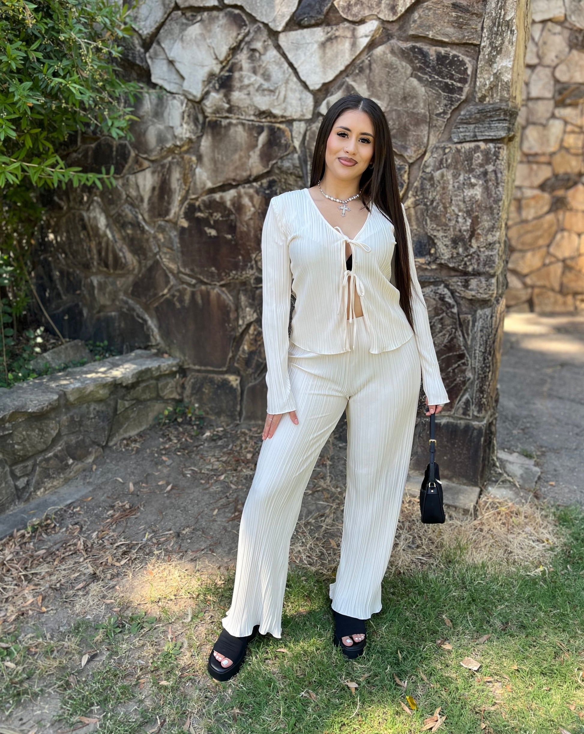 IVORY LONG PLISSE TOP AND ELASTIC WAISTBAND PANTS SET