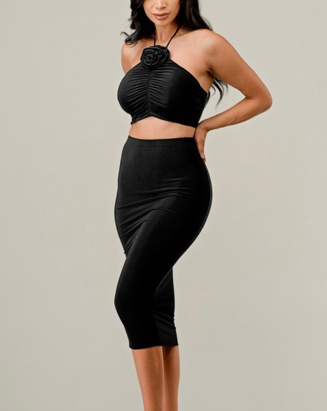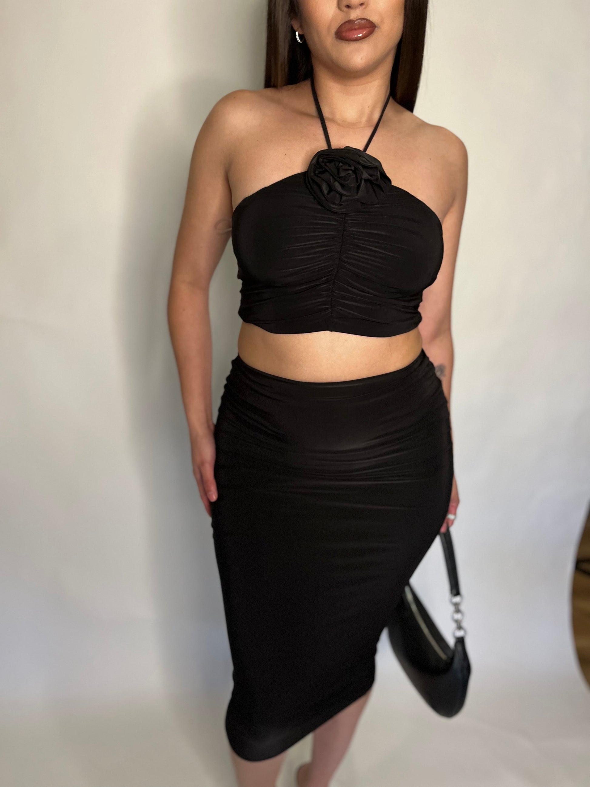 Black ruched top skirt set with a beautiful flower detail